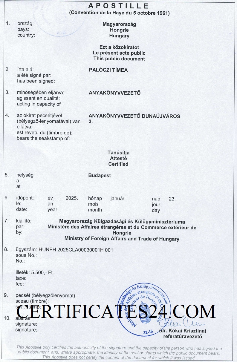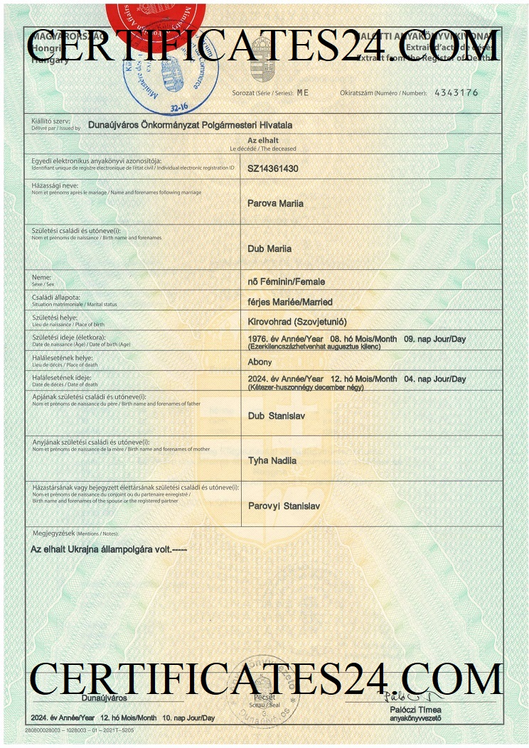 За бажанням клієнта, свідоцтво про смерть в Угорщині, може бути засвідчено апостилем та перекладено українською, англійською або іншою мовою.